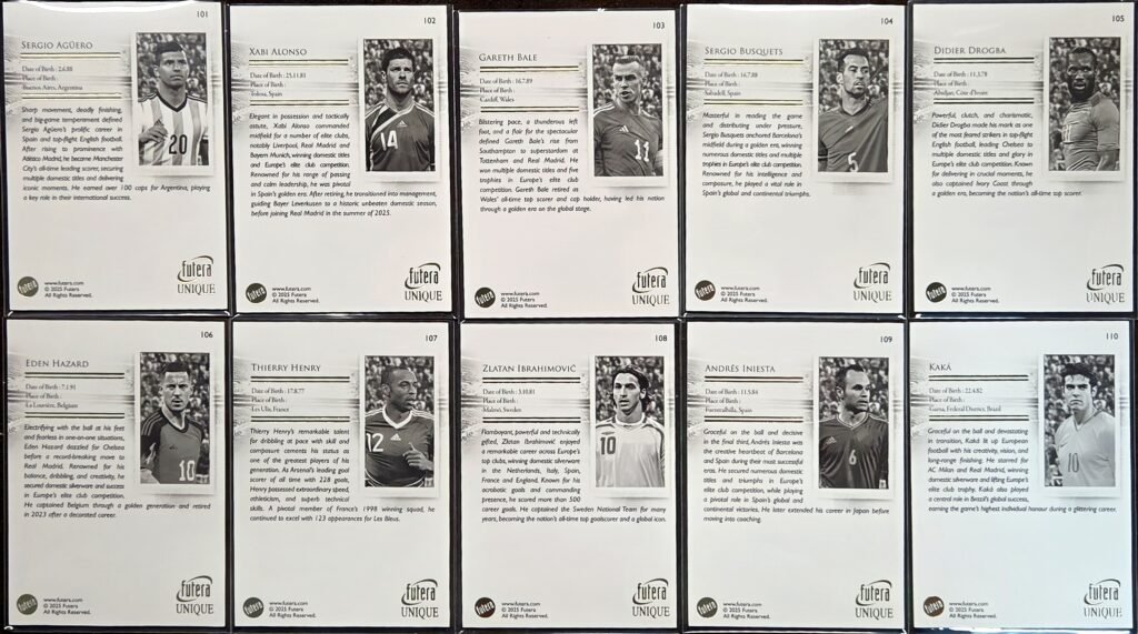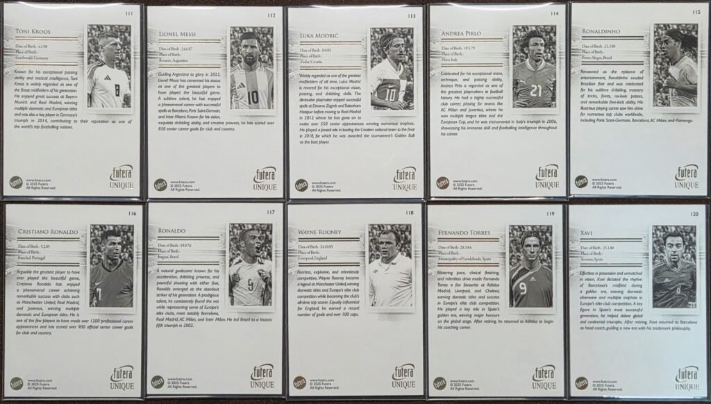 ards #101-120. “The Greats.” This section is pure history, featuring #112 Lionel Messi, #116 Cristiano Ronaldo, #115 Ronaldinho, #118 Wayne Rooney, and closing the set with #120 Xavi.